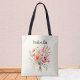 Esta elegante bolsa de tote mostra uma imagem colorida de um buquê de flores amarrado à mão. Personalize o saco com um nome, que aparecerá acima da imagem floral. O design é o mesmo em ambos os lados do saco.