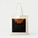 A bolsa de tote de casamento escura e dramática apresenta uma flor metálica moderna de cobre-áspera com texto personalizável sobre fundo preto.