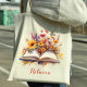 Esta bolsa de tote pode ser personalizada com um nome e apresenta uma variedade de flores silvestres coloridas e borboletas em torno de um livro aberto. Este design bonitinho faria o presente perfeito para qualquer livro ou amante da natureza!