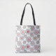 Esta bolsa de tota tem um médio de flores moderno século design, feito de círculos em tons de rosa, amora e bege e linhas pretas.