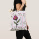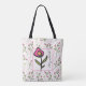 Um saco de tote com seu nome personalizado e um quadro quadrado de dentro de flor rosa bonito com uma borda rosa. O fundo é um padrão com flores silvestres cor-de-rosa desenhadas à mão, com caules longos e folhas verdes sobre um fundo branco de casca-de-ovo. Círculos cor-de-rosa e galhos também decoram o design. Design floral branco e bonito.