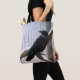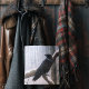 Um corvo preto sentado em um galho de árvore. Inverno e árvores ao redor com neve caindo