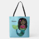 As meninas personalizaram o afro-americano, preto, sacola étnica dos miúdos da folha do falso da sereia. O fundo bonito, azul gosta do oceano. A sereia pequena adorável com falso foil a cauda verde, a camisola de alças cor-de-rosa magenta e a estrela do mar cor-de-rosa em seu cabelo preto escuro. Personalize na parte dianteira do bolsa com nome no roteiro bonito. Edite para mudar escolhas da pia batismal. A parte traseira tem a cauda da sereia do divertimento no verde da folha do falso. Sereia, merman, e artigos de coordenação do pirata. Contato para pedidos da ordem feita sob encomenda. Sereia, oceano, design temático da vida marinha. ww.SamAnnDesigns.com