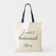 O sonho de uma criada, mostre-lhe o quanto aprecia o seu serviço com esta adorável bolsa. Apresentando um fundo branco de canvas, "Junior" é escrito em fonte azul-cursiva com Bridesmaid impresso por baixo. Na parte inferior está um lugar para inserir seu nome em texto azul itálico. Excelente para uso diário.