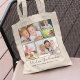 Celebre a vovó com esta bolsa de tote personalizada com uma colagem fotográfica das suas pessoas favoritas. Você pode personalizar com seis fotos familiares de netos, familiares, animais de estimação, etc, e personalizar a expressão para "Eu te amo" ou "Nós te amamos", e se ela é chamada de "vovó", "vovó", "mãe", etc. Você também pode adicionar os nomes dos netos ou netos.
