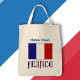 Saco de tote com design na frente apenas mostra a bandeira francesa com a palavra FRANCE abaixo em letras coloridas com o tricolor francês. Acima é um lugar para o seu nome em letras azuis ou de outra pessoa, para que você possa criar um presente ou um olhar personalizado. Excelente para o Dia da Bastilha. Divertido para reuniões de amigos ou familiares e eventos de clube ou viagem.