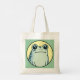 Cute tote bag featuring a funny green cartoon frog with big eyes and a deadpan look on his face on a yellow and green background.