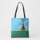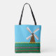 Um moinho de vento entre flores amarelas vermelhas e cor-de-rosa das tulipas. Este design parece realmente eficaz nesta Tote Bag