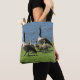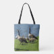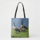 Características deste design da sacola uma foto de um número de gansos de Canadá, incluindo dois pássaros adultos e diversos ganso. Estão estando na grama verde perto da costa por alguma água cinza-azulada.