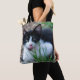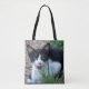 Gato de tuxedo preto e branco, bonito, com a língua esticada, escondido atrás da taça.