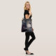 O Halloween assombrado personalizou a bolsa de tote apresentando uma paisagem noturna com gato preto, aranha e morcego na lua de cheio. Na árvore estão sutis luzes de festas.