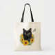 Saco de tota de algodão com design de gato preto. Adicione seu primeiro nome em preto no topo. A design ilustrada apresenta um gato preto vestindo uma coroa de girassol. A design é impressa apenas em um lado, com cores de alça opcionais.