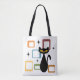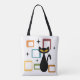 Ilustração colorida do estilo do Meio século abstrato com gato preto, estrelas pretas e ornamentação colorida em fundo branco. Você pode adicionar seu nome/monograma para personalizar o item.