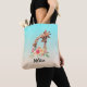 Uma bolsa de tote com um desenho fofo em aquarelas de uma mãe e girafa bebê. A girafa-mãe está descansando a cabeça sobre a girafa do bebê, amorosa e adorável. Bonito buquê rosa, amarelo, verde, de flor de aquarela colocado debaixo deste par de queridos. Um fundo gradiente criado com uma delicada mistura de cor azul turquesa numa cor castanho arenoso.