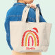 Feliz Natal Santa Hat Rainbow Personalized Tote Bags apresenta um divertido e colorido arco-íris branco com um Santa Hat abaixo é o texto que o seu nome no moderno roteiro escrito com a mão vermelha. Para personalizar, edite o texto na caixa de texto fornecida. Ver outros itens nesta coleção desenhados por Feriados do Evco https://www.zazzle.com/store/evcoholidays