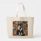 Um gato preto e branco senta-se cercado por uma abundância de flores brilhantemente coloridas em tons de laranja, azul, rosa e amarelo. O fundo é repleto de um padrão floral denso e intrincado que destaca os olhos amarelos cativantes do gato.