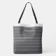 Esta sacola é mostrada com um design listrado preto e branco do impressão do divertimento. Tamanho grande mostrado. Tem correias pretas.