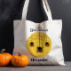 Prepare seus fantasmas e goblins para truques ou para tratar com esta bolsa personalizada de Dia das Bruxas. Apresentando uma imagem de três aranhas negras em uma teia de aranha, tipografia de script que diz, "Feliz Dia das Bruxas", mais um nome personalizável, este bolsa é perfeito para doces carregandos. Adicione o nome do seu filho para criar um saco de um tipo que possa ser usado ano após ano.