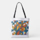 Esta imagem apresenta uma composição de abstrato vibrante criada de uma matriz de formas geométricas — triângulos, retângulos, quadrados, círculos e trapezoides que se cruzam e se sobrepõem dentro de uma estrutura quadrada. O trabalho de arte usa uma paleta de cores em negrito incluindo laranja, amarelo, azul, verde e roxo. Os contornos pretos definem cada forma, criando um efeito de vidro colorido e adicionando estrutura no meio do caos. O arranjo evoca movimento e equilíbrio, com as diferentes formas e cores interagindo harmoniosamente. O efeito geral é dinâmico e vivo, reminiscente da arte abstrato moderna ou cubista, convidando os espectadores a explorar as relações entre formas e espaços.