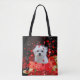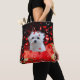 Este é meu cão de filhote de cachorro maltês pequeno bonito que senta-se em uma caixa de presente em um chá de corações vermelhos e na parte traseira sua cara pequena é contida em um coração floral macio.