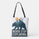 Uma silhueta de urso forte, formando uma cena de montanha tranquila com pássaros em voo, evocando um senso de aventura e liberdade. "NUNCA PARE DE EXPLORAR" enfatiza a resiliência e a descoberta.