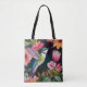 Saco de Tote apresenta pintura acrílica de um beija-flor cercado por uma variedade colorida de flores. Este trabalho de arte de pássaro botânico é brilhante e alegre! Primavera ou tema floral de verão maravilhoso para amantes de aves.