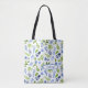 Este maravilhoso padrão de jardim apresenta flores azuis e verdes. Há uma variedade de folhas, flores e samambaias em ambos os lados do saco de tote. A frente deste bolsa pode ser personalizada.