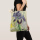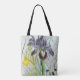 Uma bela ilustração vintage das flores da íris embelezadas com um florescimento caligráfico na sua escolha de bolsa de qualidade. Sua escolha de cor de fundo tanto na parte de trás quanto na frente. Disponível em uma seleção de opções de tamanho e tecido. Uma bela e amiga do ambiente. Muito único e muito adorável.