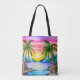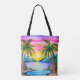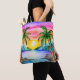 Escape to a glowing shoreline with this Island Tropical Beach Sunset design. Two palm trees frame a calm lagoon and distant mountains as the sun sinks into the water, flooding the sky with rich pink, orange, and golden light that melts into cool turquoise and violet hues. Bold, saturated color and soft gradients give the artwork a dreamy vacation-poster feel, capturing the relaxed warmth of an evening on a quiet island coast.