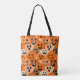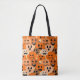Esta bolsa de tote tem um design de jack-o-lanternas com diferentes faces se repetindo em cada quarto.