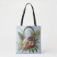 Imaginem um saco de tote perfeito para corridas de fadas, decorado com folhagem tropical ao estilo havaiano apresentando uma janela arqueada com flores de hibisco e samambaias adorando-a. Matizes suaves de cor de tons de terra complementados por uma gama de samambaias e folhagem. O verso tem uma visão diferente de um verde floral semelhante.