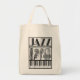 Saco de jazz branco e preto. A design tem uma variedade de instrumentos musicais, incluindo clarinete, baixo ereto, microfone velho, trompete, piano e batente. Saco de excelente do dia a dia para amante de música, professor ou estudante. O trabalho artístico original foi feito em carvão.