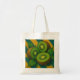 Esta bolsa de tote apresenta três kiwis fatiados com ricos interiores verdes e peles marrons texturizadas, realçados usando uma escova expressiva. O pano de fundo é constituído por faixas de cor amarelas da mostarda diagonal e profundas, gerando um contraste notável com os tons legal de kiwi. As folhas são pintadas em verduras multi-tonais, dando profundidade e equilíbrio à composição.