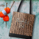 Lined tote bag with all-over knitting print. Camel brown rib stitch knitting wraps around this bag, with black trim on the bottom to match the handles. Include personalization on one side, with name, or saying in script with black shadow. Sample wording is, "Elizabeth's Wool" in off-white color. Text is on one side only, or delete the sample to order blank.