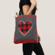 Esta sacola caracteriza um fundo cinzento de serapilheira com afiação vermelha de serapilheira e no centro um coração da xadrez do búfalo vermelho e preto com o laço do vintage do falso que afia o. Projetado pelo ©Tim mundialmente famoso Coffey do artista.