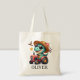 Esta bolsa de tote personalizada adorável e caprichosa apresenta um encantador fazendeiro trex dinossauro com óculos escuros conduzindo alegremente um trator vermelho miniatura.