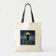 A stylish tote bag featuring a radiant figure descending over a glowing city beneath a star-filled night sky.