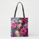 Saco com uma hispânica ou latina com flores bonito, cor-de-rosa e azuis, no cabelo. Arte digital impressionante.