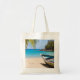 Um saco de tote de canvas com uma cena de praia tropical idílica. Água clara de cristal azul turquesa e uma praia arenosa castanha macia. Algumas folhas de palma penduradas de cima. Um velho barco a remo de madeira fica sentado na praia. Uma paisagem serena e pacífica.
