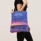 Um saco de tote com uma fotografia encantadora com cores marcantes de roxo, azul e rosa no pôr do sol. Uma bonito linha costeira espalhada por rochas.