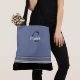 Uma bolsa moderna com bloqueio de cores limpas e personalização elegante. Este design apresenta listras suaves em azul, preto e branco sobre uma silhueta clássica de lona, com uma inicial preta decorativa e seu nome personalizado em caligrafia branca nítida.
