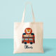 Esta adorável mala personalizada de tote para crianças mostra um leão caprichoso pregado no topo de um clássico ônibus de dois andares de Londres.