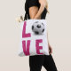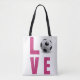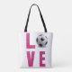 Love Soccer word design com letras faíscas cor-de-rosa quente e o "o" é substituído por uma bola de futebol.
