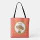 Um saco de tote com um macaco bebê fofo com um pacificador no seu círculo Dentro da boca e verde-azeitona. A palavra Hello acima de sua cabeça, que pode ser personalizada com um nome ou outro texto. O fundo é um padrão de bolinhas laranja e branca.