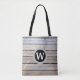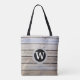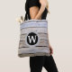 Você vai adorar esta rústica, mas moderna lenha de praia, parecendo um saco de tote monograma! Letra monográfica branca em círculos pretos e cinzas e um padrão de fundo de estilhaços de madeira.
