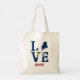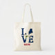 Maine, amor. Principal em letra vermelho brilhante maiúscula. A palavra amor está preenchida com a bandeira estadual e a letra O apaixonada é moldada na silhueta do estado de Maine.