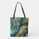 Eleve seu transporte diário com esta linda bolsa personalizada com um design abstrato luxuoso. A arte imita a beleza orgânica da arte fluida de tinta alcoólica, girando com tons ricos de azul profundo, turquesa e azul aqua, acentuados por veias elegantes de folha de ouro falso e texturas cintilantes.