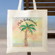 Este Saco de Tote Mele Kalikimaka é decorado com uma palmeira pintada à mão, decorada com luzes e bolhas sobre fundo de aquarela. Original Watercolor © Michele Davies.