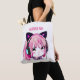 Saco de tote de garota personalizada com nome ou citação. Menina de anime, rosa, branca e roxa, com olhos tristes e fones de ouvido vestidos. Bonito para jogadores ou amantes de música.