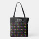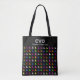 Modern custom text and initials tote bag. Colourful angel pattern on a black background.